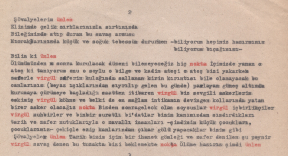 Daktilonun büyülü bir tarafı var. Arkaik bir tarafı var belki. Steno, klavye, bilgisayar gibi şeylerden daha mekanik, sanki “tren”le ilgili bir tarafı var. Eski bir teknoloji olarak baş döndürücülüğü “tinsel” değerinden geliyor belki de. Bu değer konusunda eminim yazarların, şairlerin oldukça kabarık bir dosyaları vardır ama bendeki gariplik daktilo teknolojisini kullanmak konusunda. Aşağıdaki örneklerden de görüleceği üzere “somut” denebilecek bir anlayış var topografide ama bu yerleştirme merakı kesinlikle sessel bir düzeni hedef alarak gelişmemiş. Diyeceğim o ki, belki de şiirim uzun süre “daktilo” ile arama sıkışmış. Bin sayfaya yakın daktilo arşivinde gördüğüm, şiirin hep benimle daktilo arasında kalmışlığı. Bazen birşeyleri kaydetme telaşı, bazen sırf otomatik yazının amatörce denenmesi ve yandaki birkaç örnek dışında “şairin yığınla sustuğu” aracın ise her parmak vuruşunu yakıt gibi kullanarak çalıştığı uzun ve acayip bir dönem.