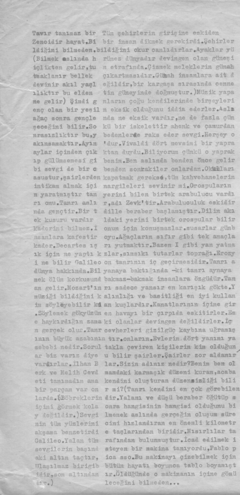 92 ile 95 arasındaki metinlerden seçtiğim şu birkaç parçaya dikkatinizi çekmek istiyorum. Benim şiirde “ses” ile ilgim hiç olmadı denebilir. Bu bir eksiklik mi, bir seçim mi yoksa bir çeşit güdülenmemi burasını karıştırmadan söylersem, 5-6 çekmecelik tüm arşivin içinde “sessizlik” büyük yer kaplar. Yazılan şeylerin acemiliği bir yana, hemencecelikleri ve oradalıkları da yine ilginç geliyor bana. Lise 2 Matematik ödevimi kolaj ile yaptığımdan mıdır nedir, her zaman kolaj denen şeye ilgim oldu. Bu ilgi, “textual collage” denebilecek bir alanda, daktilonun sağladığı imkanlar ile de birleşince ortaya ilginç birkaç şiir çıktı. Bu şiirlerden birinin en kaba hali aşağıda görülebilir. Enis Akın’ın Beyaz Manto’sunda geçen senelerde yayınlanan “Leziz Ceset Oyunu” ise sanıyorum o dönemlerden bu dönemlere gelebilen ender örneklerden biri.